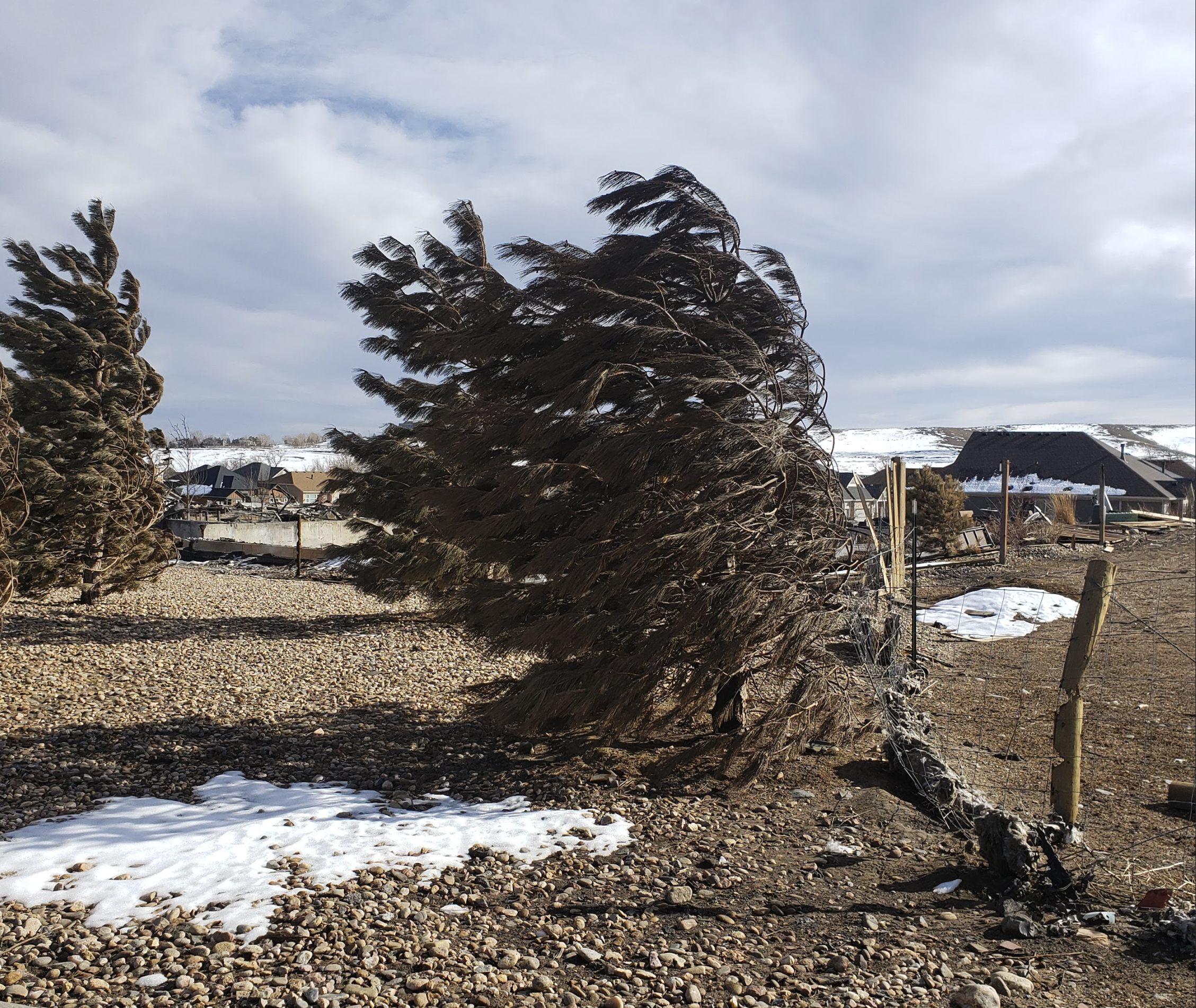 Trees frozen in place after the winds from the Marshall Fire. Photo courtesy of Anna Kramer.